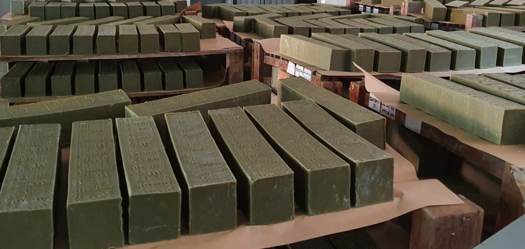 Binnen 2 dagen is de zeep afgekoeld, droog en hard geworden. Dan worden er grote blokken in stukken van 35 kg verdeeld (zie foto). Deze stukken worden weer in blokken gesneden van 200, 400 of 600 gram en aan 6 kanten bestempeld.