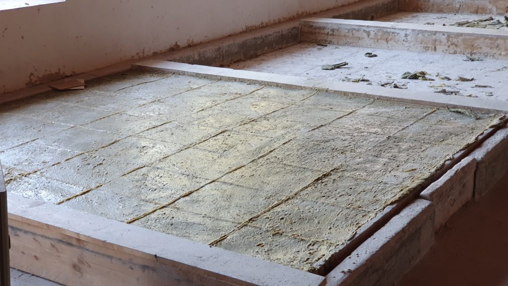 Nu kunnen de zeepketels geleegd worden; via een houten geul wordt de hete, vloeibare zeep naar de droogkamers gepompt en uitgegoten over een in vakken verdeelde betonnen vloer.