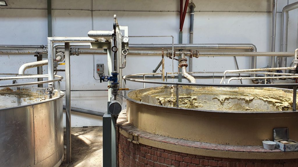 We zien een grote hal met enorme ketels. Hier wordt op werkdagen olie, loog en water samengevoegd en gedurende 10 dagen gekookt op 100-120 graden. De verzeping zet in, er moet voortduren geroerd worden.