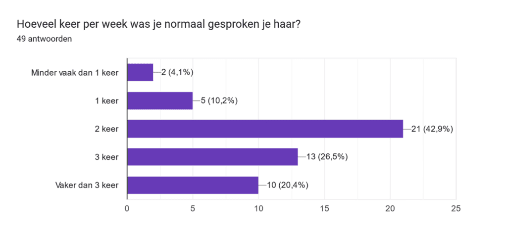 De meesten wasten hun haar gemiddeld 2 keer per week (43%). Maar een aanzienlijk deel wast het haar 3 keer of vaker per week. Over het algemeen raden wij aan om niet vaker dan 2 a 3 keer per week het haar te wassen omdat vaak wassen de talg productie stimuleert waardoor het haar steeds sneller vet wordt.