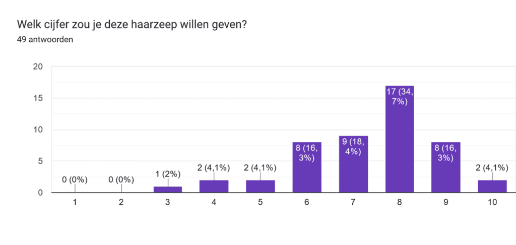 55% van de deelnemers gaven als eindoordeel deze haarzeep een 8 of hoger. Een mooie score!